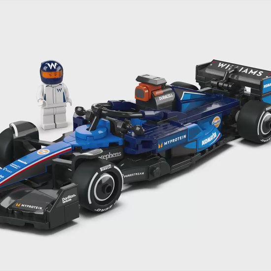 The F1 model car features a cockpit that opens by lifting the halo bar, a rear wing, wishbone suspension, sponsor stickers and wider rear tires imprinted with “Pirelli.” The buildable F1 toy car also comes with a driver minifigure wearing a Williams Racing outfit and a winged helmet to place inside the cockpit.