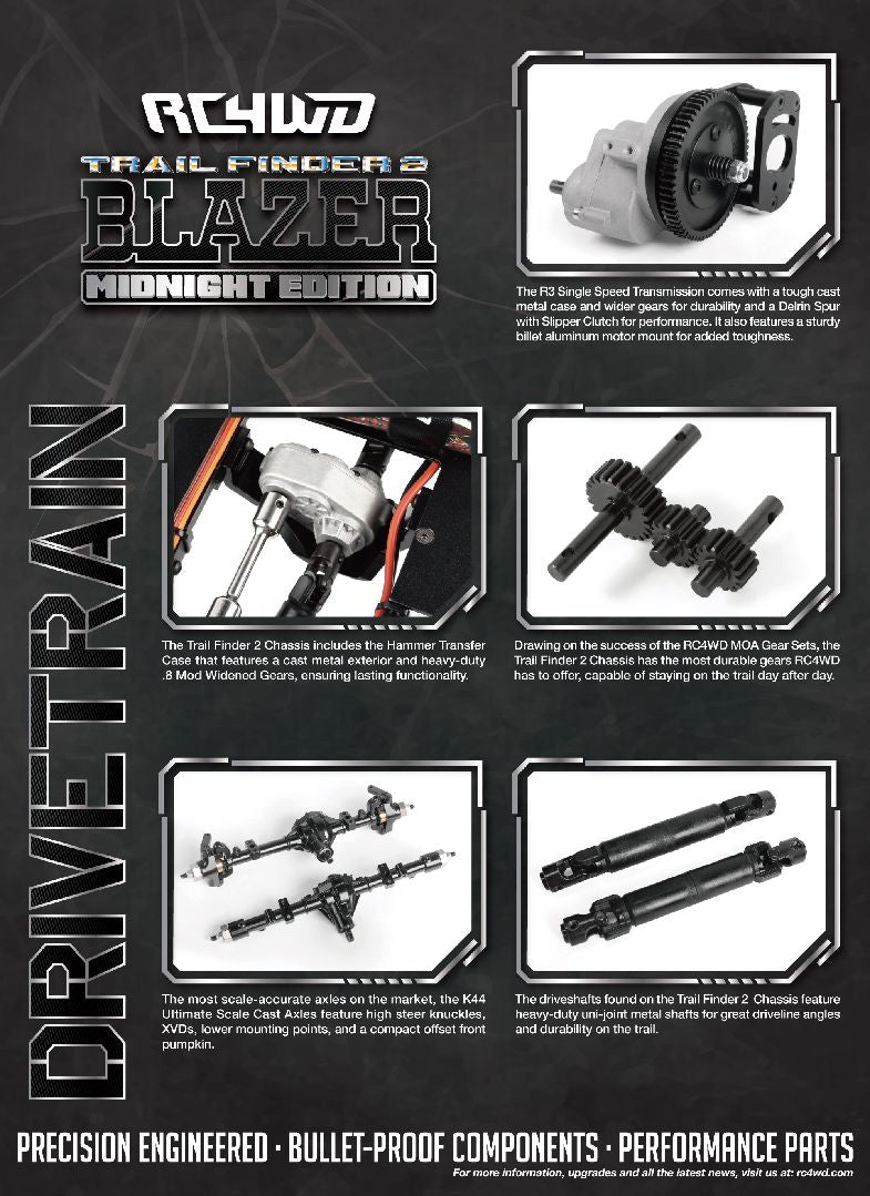 Ultimate scale is back, in black, with the sleek RC4WD Trail Finder 2 RTR w/ Chevrolet Blazer Body Set (Midnight Edition)! This RTR brings an all-black-everywhere approach, with the chrome finish from the trim and accessories blacked out, giving the Chevrolet Blazer a dark and classy appearance.